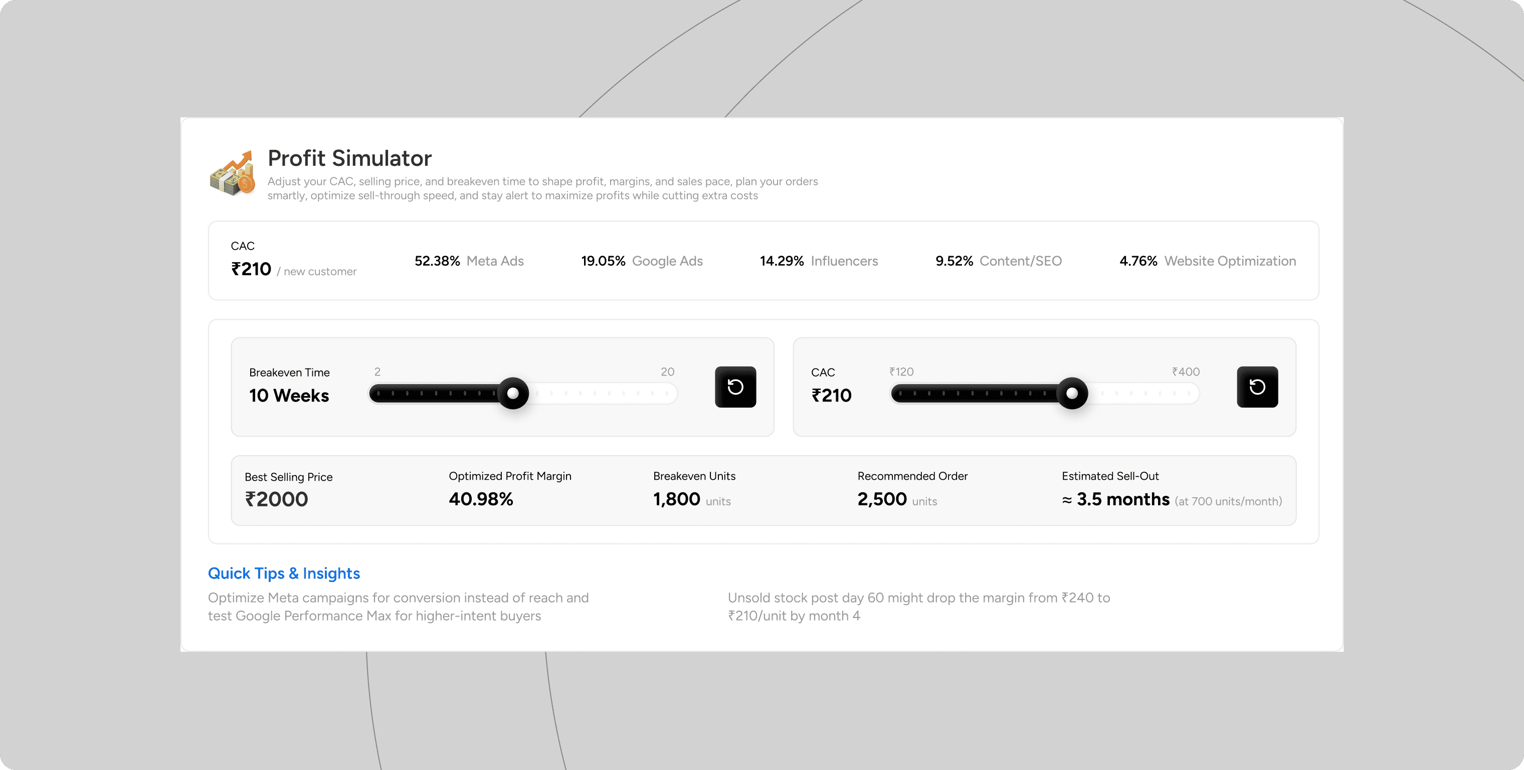 Value: This "Play" interaction helps users understand that spending more on marketing (higher CAC) might actually reduce their breakeven time by driving volume. It turns anxiety into strategy.