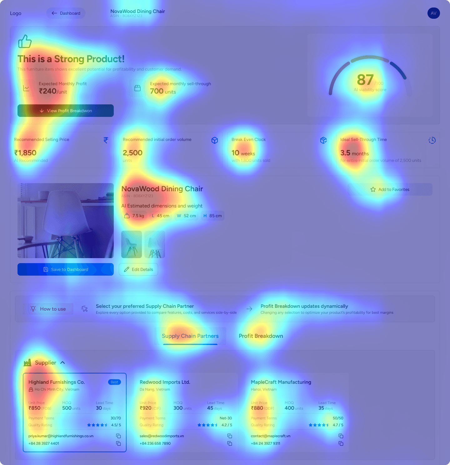 The Evidence: The heatmap confirmed this behavior. The most intense "Red Zones" were on the Viability Score and Profit Summary at the very top—bypassing the partner selection cards initially.