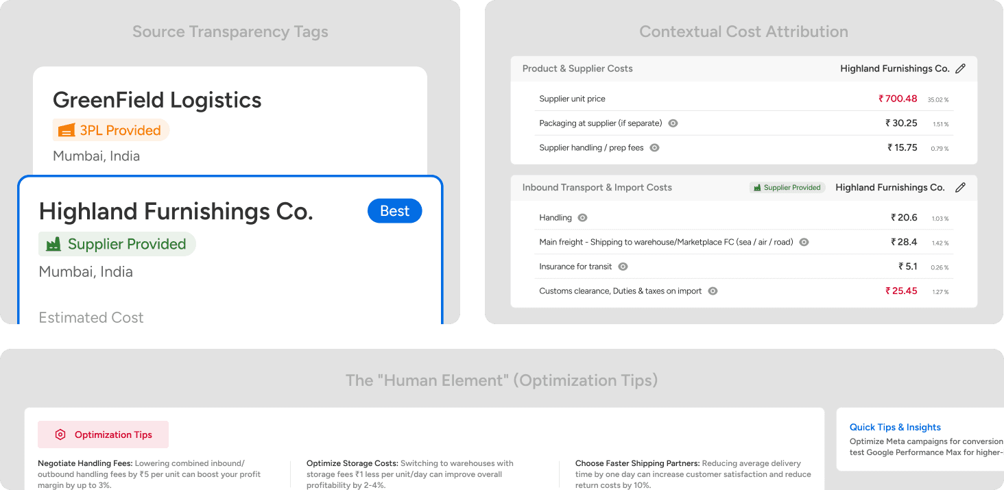 Source Transparency Tags: I added subtle tags like "Supplier Provided" or "3PL Provided" on logistics cards. This clarifies ownership instantly—if a Supplier also handles Freight, the user sees they can streamline their chain of command.
