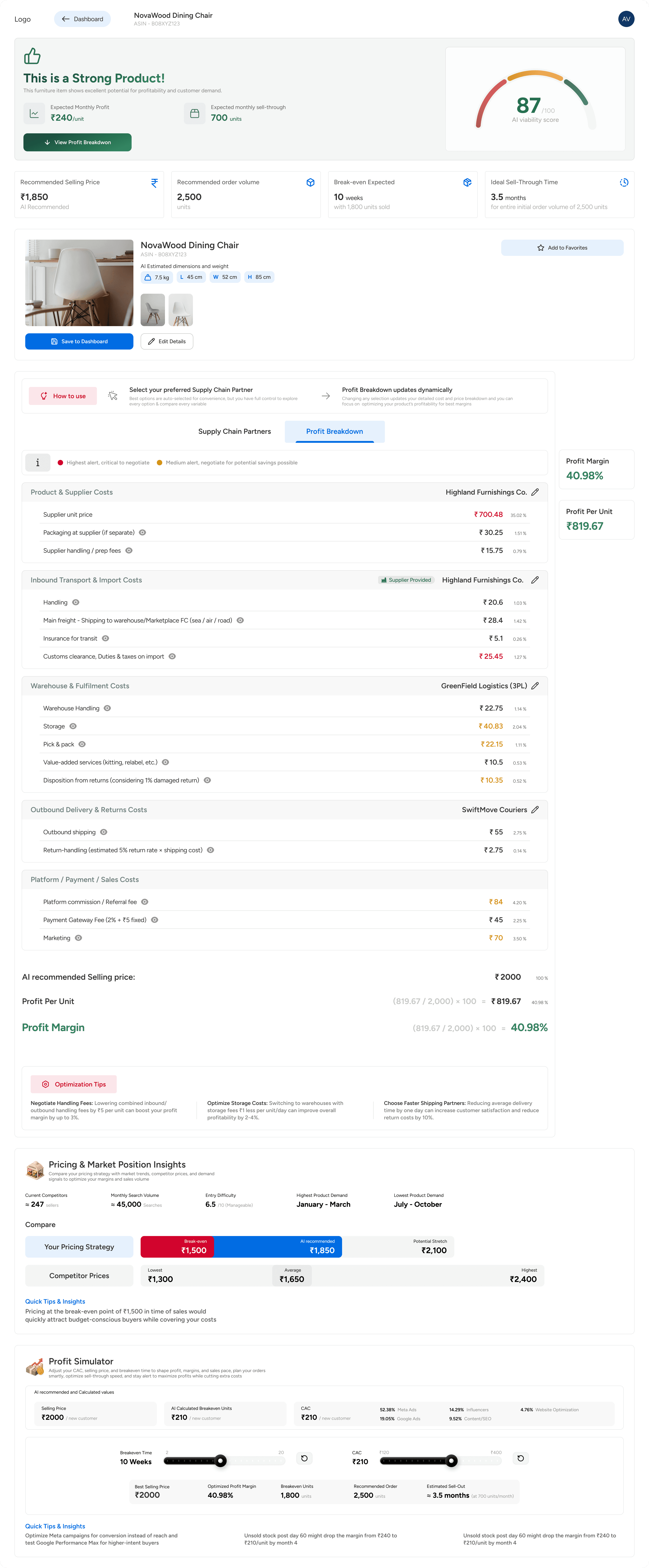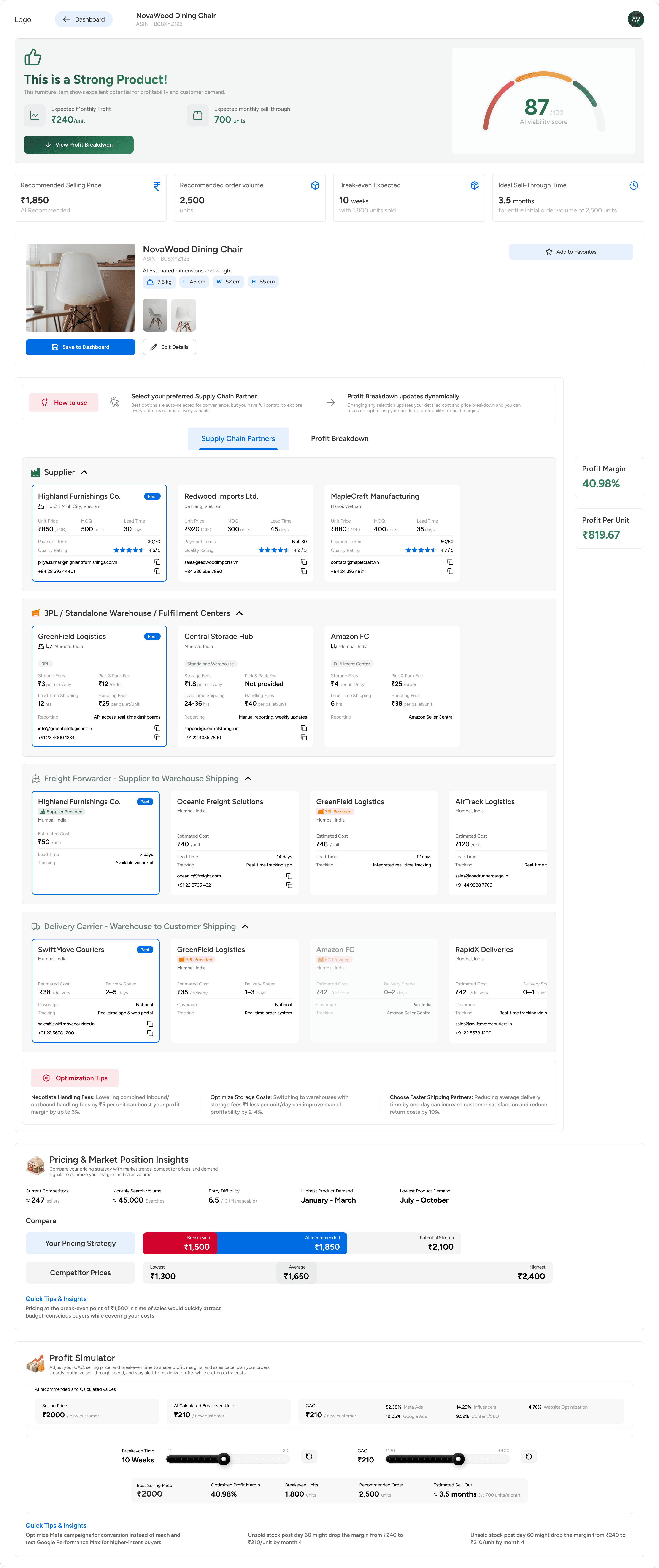 Improvement for V2: Currently, if the "Viability Score" is low, the user hits a dead end. In the next iteration, I would design an "Improve My Score" feature that suggests specific levers to pull—such as "Switch to a slower freight option to save 12%" or "Increase initial order volume to unlock supplier discounts." This turns a negative result into a constructive strategy session.