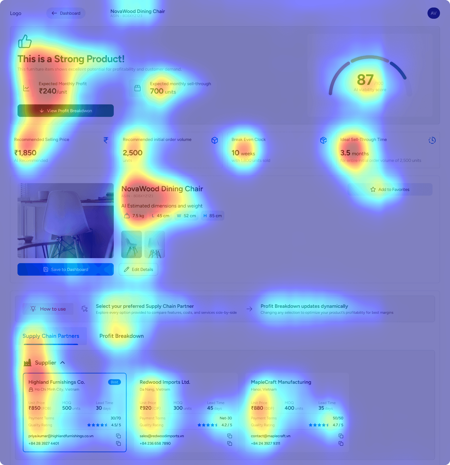The Success: The heat diffuses sequentially downwards: Verdict > Partners > Optimization. This confirms the design successfully guides users from "Panic" (Can I afford this?) to "Action" (How do I optimize?), preventing cognitive overload.