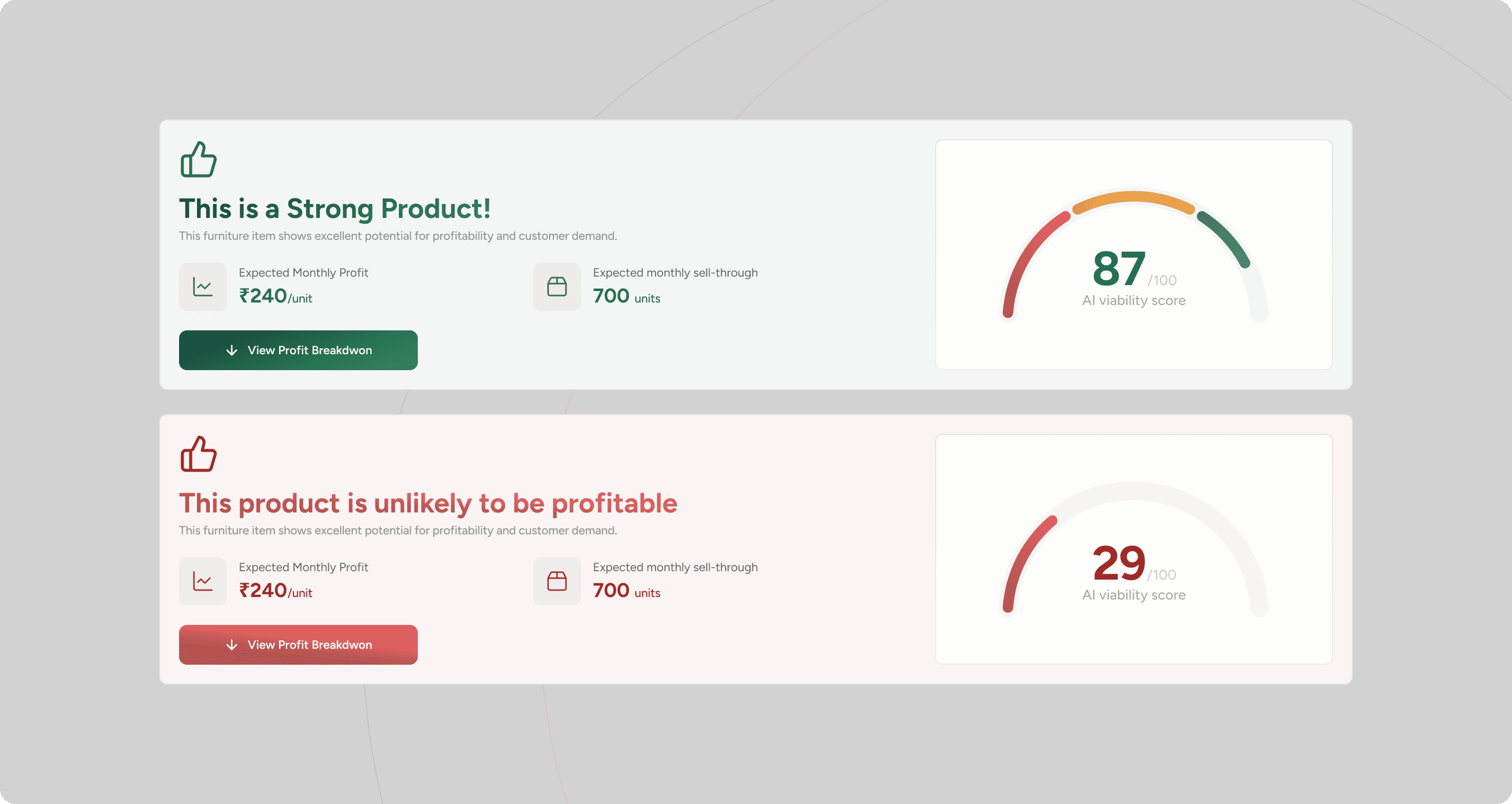 Logic: Uses onboarding data (Product Idea + Source Location + Sell Location) to give a simple "Go/No-Go" rating. It tells the user immediately if their business model is sound before they dive into the math.