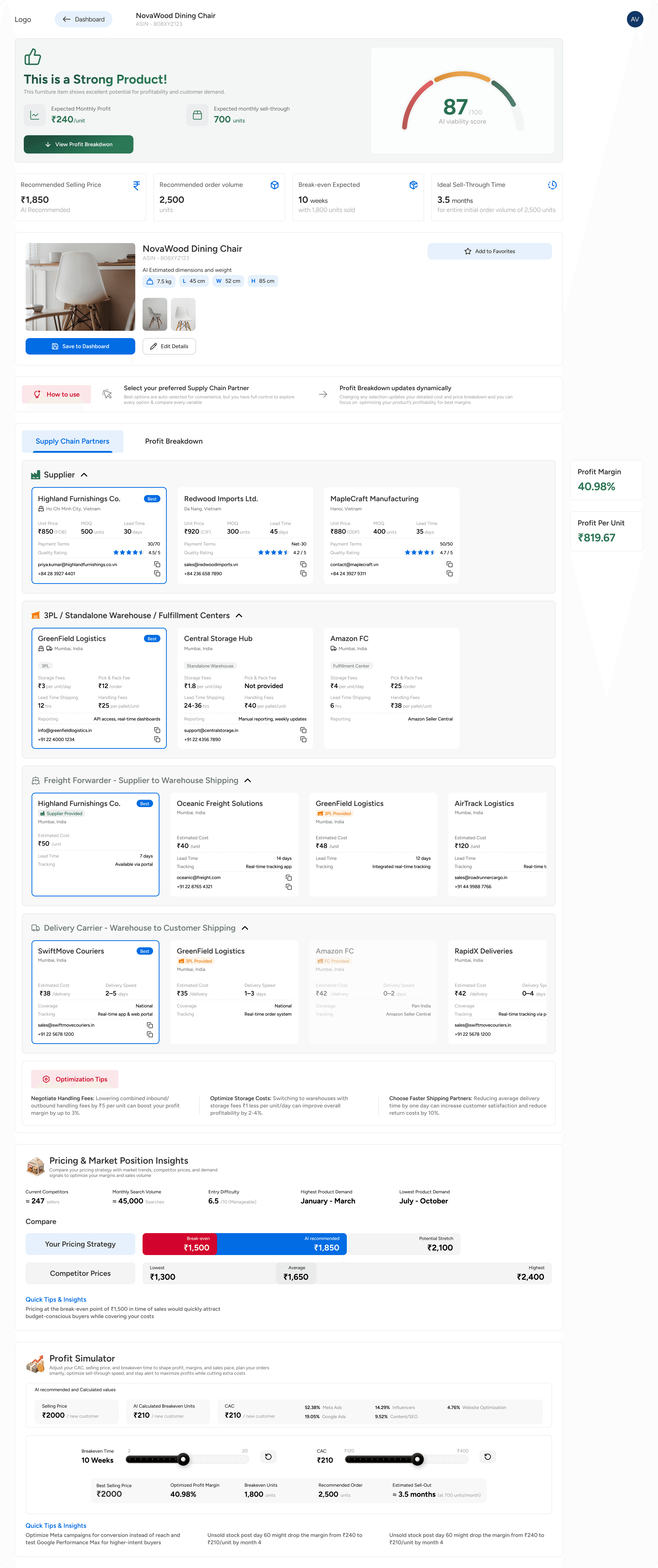 Layout Strategy: I rejected the client’s request for a "Long Scroll" dashboard, which often buries key data. Instead, I implemented a Tabs that separates "Partner Selection" (Building) from "Profit Analysis" (Reviewing). This ensures users can tweak logistics without losing financial context.