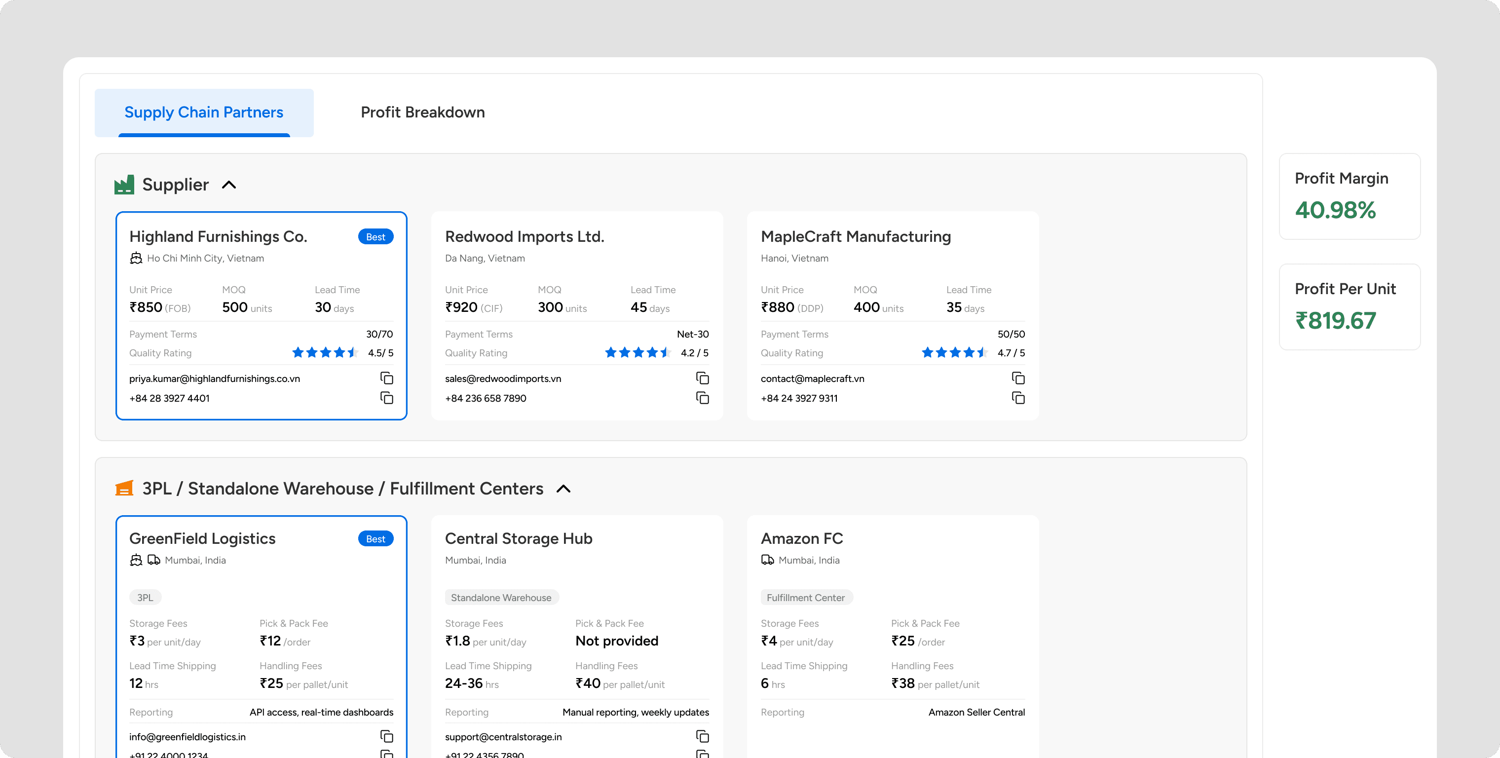 Source Transparency Tags: I added subtle badges (e.g., "Supplier Provided" vs. "3PL Provided") on every cost card. This clarifies ownership instantly—users know exactly who handles the freight without needing to guess.