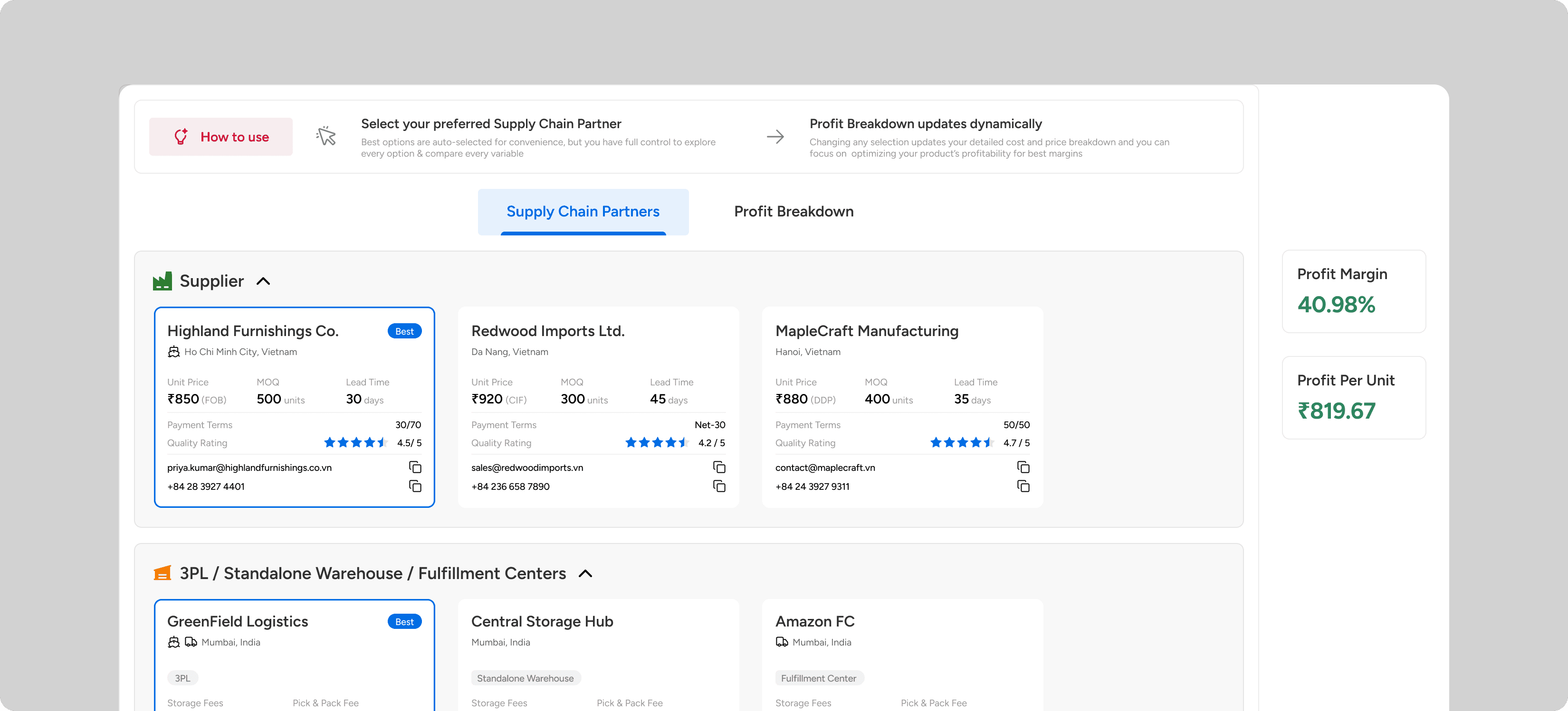 I split the interface into two focused modes using a Tab System: "Supply Chain Partners" (Selection) and "Profit Breakdown" (Analysis).